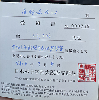 道頓堀プロレスの2月、3月大会 晴斗希5周年興行、秀美10周年興行で協力いただいた『能登半島地震災害義援金』23,906円を寄付させていただきました。