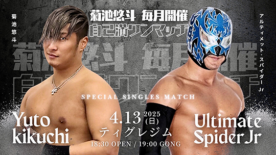 2025年4月13日(日) 時間:18時半開場、19時開始 場所:平野ティグレジム シングルマッチ 時間無制限一本勝負 菊池悠斗 VS アルティメット・スパイダーJr チケット料金 大人:3000円 中高生:2000円 小学生:1000円 未就学児無料