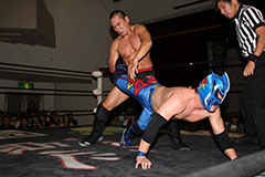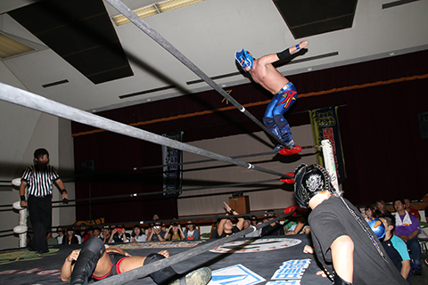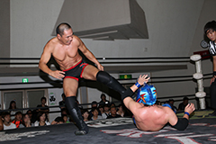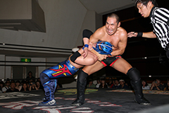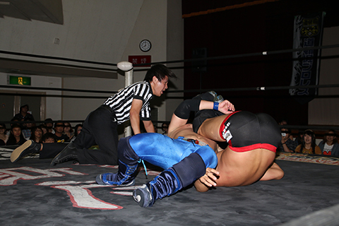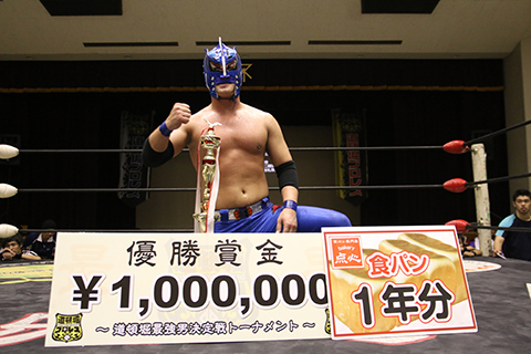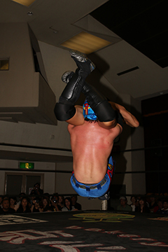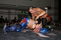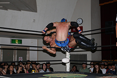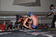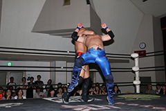 | ラ・ピート「チャンピオンとしてこのシングルのトーナメントに挑んだ今年のこの大会は絶対に負けるわけにはいかなかったです、なんせ俺がこの道頓堀プロレスのチャンピオンだから。 1回戦から決勝の今日まですべての試合。正直殆どの人が俺がボコボコにされている姿しかイメージにはないのかもしれないです。 今回このトーナメントで俺が優勝をつかめたその理由は自分が弱いことを理解したから頂点まで来れました。まだまだ、まだまだ全員に圧勝っていう試合展開は見せられてないんでまだまだ俺は特急列車だから止まりませんのでみなさん振り落とされないようにしてください! このシリーズは今日で終わり、次は9月23日の道頓堀プロレス2周年大会が弁天町・世界館であります。 優勝した特権として勝手に言わせてもらうけど俺はまだ道頓堀プロレスが旗揚げしてから2年経つけど唯一、シングルで戦ってない奴が居るんですよ。そいつと次の2周年大会でこのベルトを掛けて戦いたいと思います。 その相手は・・・信玄だ!! あの怪物にだけまだ1対1で戦ったことがありません。 どうなるかわかりませんが、後ろも壁、目の前も壁ならただ必至にやるだけなんで、9月23日の俺の防衛戦、楽しみにしていて下さい。」 HUB、そしてタダスケがラ・ピートを挑発してリングを後にした。 |