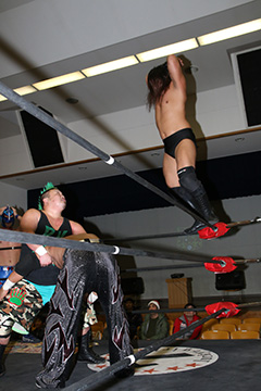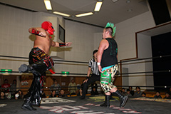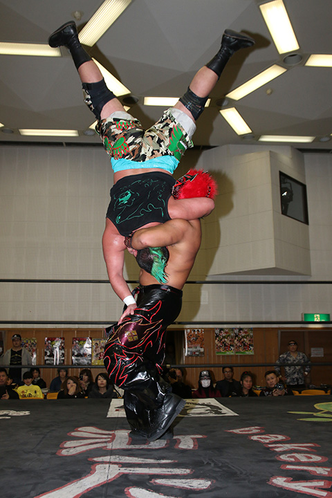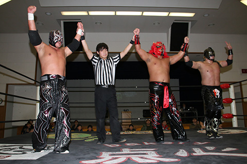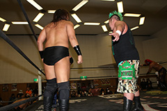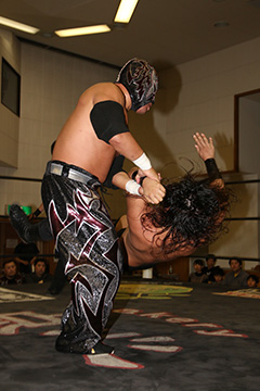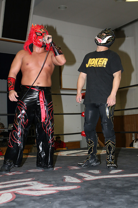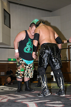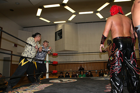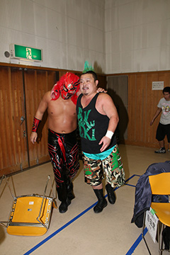| ※試合後、平成極道コンビが翌11日に対戦が決定している信玄&ガメラスを挑発。 星野「お前たちにこの俺ら平成極道コンビが胸貸してやるよ。お前たちに俺らの恐ろしさをしっかり叩き込んでやるから覚悟しときなさーい!首を洗って待ってなさーい!」 信玄「おい待てこら!極道コンビだ?この野郎!可愛い顔しやがって!いいか俺とガメラスが、本当の極道の意味を教えてやるよ、この野郎!なんなら今やってもいいぞ!」 星野「てめぇら言ったな。はいたツバ飲むなよな!」と捨てぜりふを吐いて引き上げる。 信玄「俺とガメラスが極道コンビ、真っ二つにしてやるからよ。あいつらの死に様、お前ら見に来いよ!」 |
