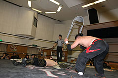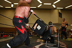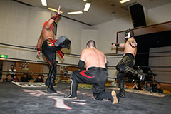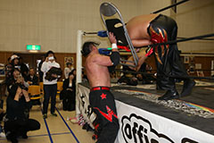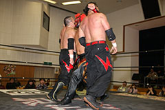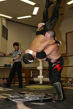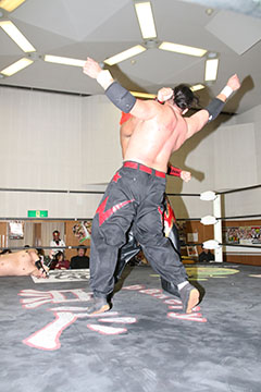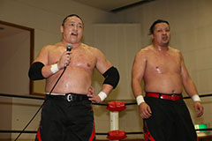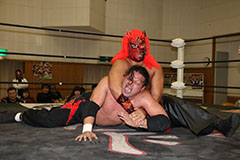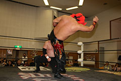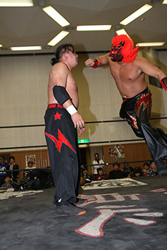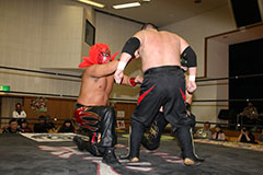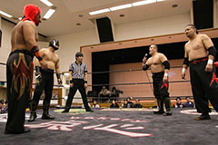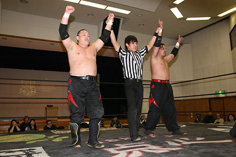 | 平成極道コンビの要望でハードコアマッチに変更。 椅子を巧みに使う平成極道コンビにガメラスが捕まる展開が続き、信玄が何度も反撃するも最後は星野のダイビングセントーンでガメラスを沈めた。 試合後、平成極道コンビは道頓堀プロレスに対して2/6大日本プロレス大阪サプライズのカードをあけて待ってると参戦を要求した。 |