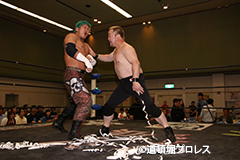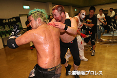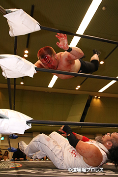 | 沼澤「俺らは今日、大日本プロレス仙台大会があるのに来てやってこれだよ。もう回りくどいことはいいんだよ。とっととお前(ヲロチ)とHUBの持ってるベルトよこせ。回りくどいことしなくてもいいだろ?それにお前、蛇にも足あるのか?俺らとベルトかけろ、その答え、今この場で聞かせろ」 ヲロチが了承したため25日最終戦でのタイトルマッチが決定した。 沼澤「じゃぁ首洗って待ってろ。おい、道頓堀のファン!引いてんじゃねえぞ。こんなもんじゃすまねぇぞ」 菅沼「おい!タイトルマッチが決まったはええわい。ワシはどないするんじゃ?俺は前、言うたよな、死んでも生き返るって。お前ら必ずぶっ倒してやるからな。18日の大日本、俺とヲロチが組んで雑魚と組まれてるけどお前らが出てこい」 沼澤「じゃぁ18日そんなに死にたいんだったら大日本プロレス大阪サプライズで今日と同じカード、但し大日本プロレスを味わえよ、ハードコアマッチだ」 18日、大日本プロレスのヲロチ、菅沼組の対戦カードが神谷、佐久田組から沼澤、竹田とのハードコアマッチに変更となった。 |