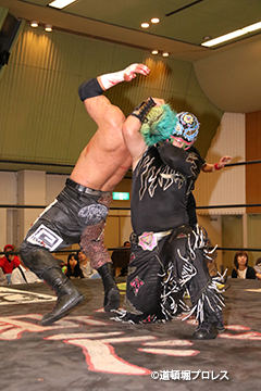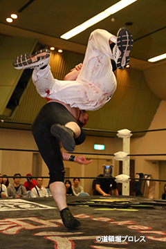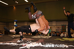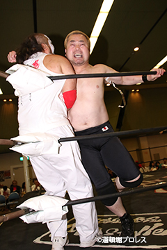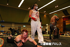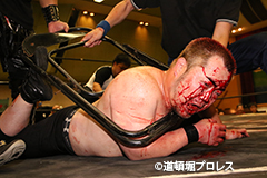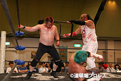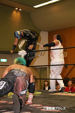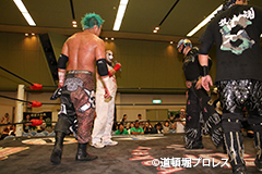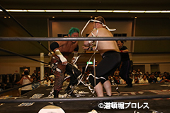 | ヲロチ、菅沼は入場してきた沼澤、竹田を急襲。しかし場外戦で菅沼が大流血に追い込まれる。何度も反撃を試みるが今度はヲロチが膝を負傷。最後はレフェリーがストップ。 試合後、沼澤がベルト挑戦をアピール。 |