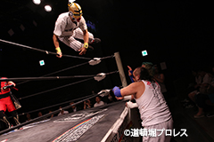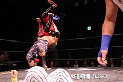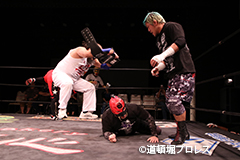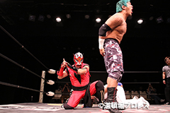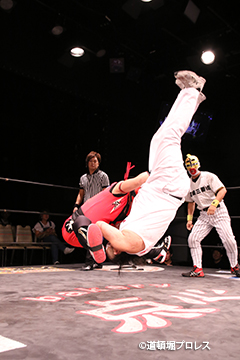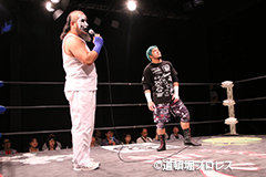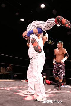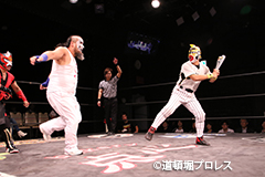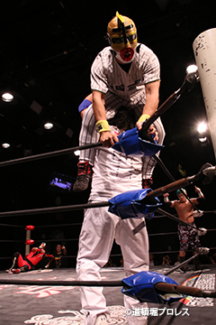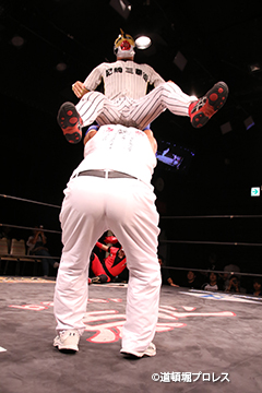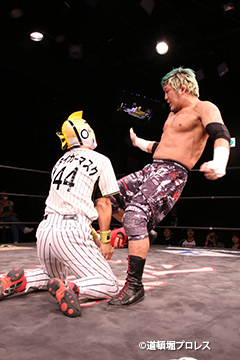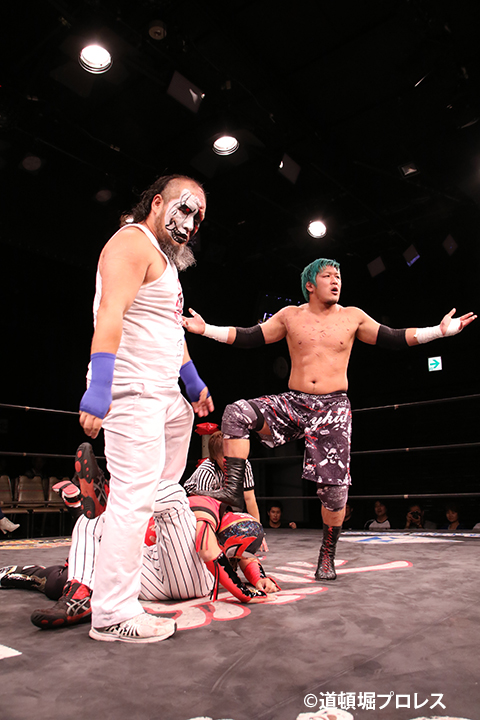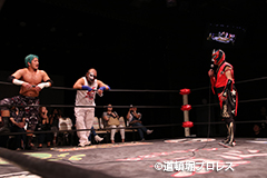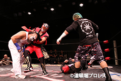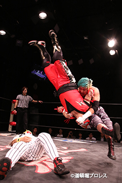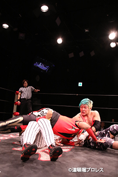 | ※ヲロチ欠場によりHUBがリング上より事情説明 HUB 『道頓堀プロレスからベルトを返上して新たなパートナーと組んでタイトルマッチをするよう言われたが、このベルトは俺とヲロチの絆の証。だから延期にしてほしい」 そこに沼澤、竹田が乱入しHUBに「今やってやろうか』と詰め寄り襲いかかる。 対戦を控えた赤城、めでタイガーマスクがHUBの救出に登場しそのまま試合開始。 |
