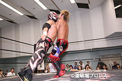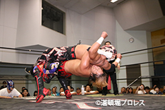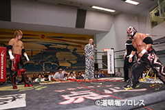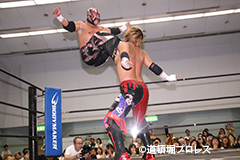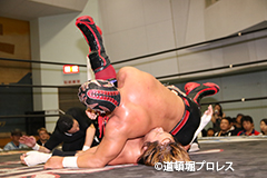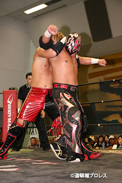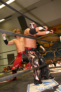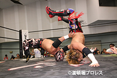 更に場外で岸和田のテーブルクラッシュのボディプレスでカウント19ギリギリでリングに戻ったTORUは終盤ラストライドをウラカンラナで切り返すもカウント2で返される、更に投げっぱなしドラゴンスープレックスからドラゴンスープレックスホールドと畳みかけあわやと思わせるも3カウントは奪えず