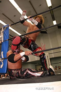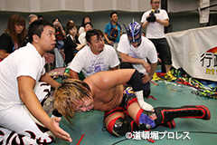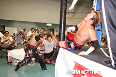 場外での椅子攻撃をきっかけにTORUの足を徹底して攻め続けペースを握る岸和田。