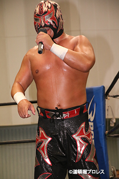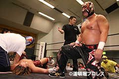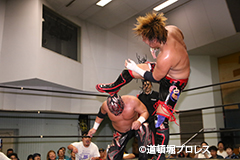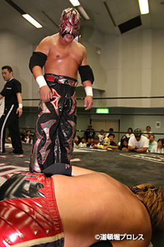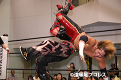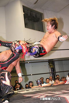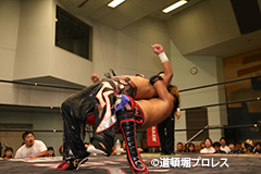 もう一度ドラゴンをねらうもこらえられ、逆に岸和田のカウンターの強烈なラリアットを食らう。
