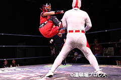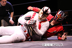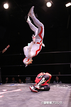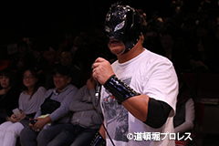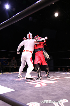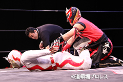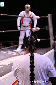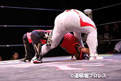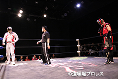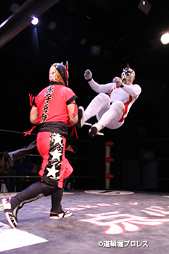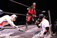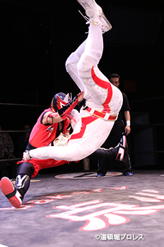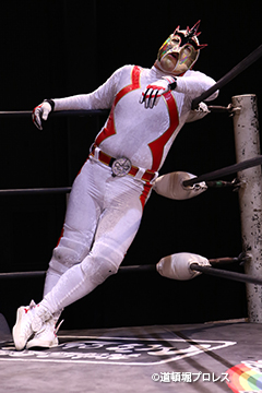 | 二人ともお笑いを封印したまじめなプロレスで5分経過。見かねて試合を終えた空牙が試合中にもかかわらずマイク。 空牙「いつもみたいな試合せぇへんの?そんな試合したところで菅沼みたいにエントリーできると思ってるんか?楽しい試合をお客さんも求めてるやろ?」と問いかけると太陽も赤城もタッグキングにエントリー出来なかったことが不満の様子。 「エントリーはさすがにもう無理やけど、でもお前らにちょうどええ感じの新しい道頓堀プロレスのベルトを用意してやるよ、お笑い的なベルトをな。」 |