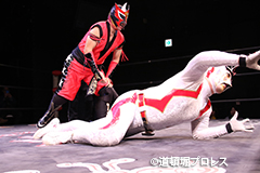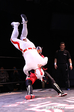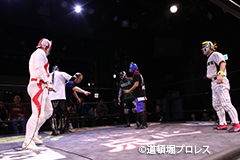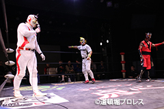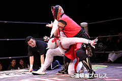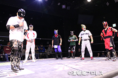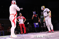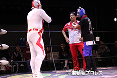 | 俄然ヤル気になった2人はいつもの楽しく激しい試合展開へ。最後はファルコンアローで赤城が勝利。 敗れた太陽は「ベルト掛かってる試合って今日じゃないですよね?」 空牙が12/23の最終戦でもう一度お前らで争えと伝えるとめでタイガー、イヌナキン、ガトーに加えなぜかヒロトウナイまでリング上へ。主旨が違うと太陽に促されトウナイは引き上げる。 そこに菅沼も「俺はもともとこっちの人間やから狙わせろ!」と名乗りをあげるが空牙「今はタッグキング優勝狙う時やろ」菅沼「1回戦で負けたらええやん」と言い争い引き下がらせられる。 名乗り出た人数が増えたためバトルロイヤルでベルトを争うことに! 太陽塔は全国のお笑い、ゆかいレスラーに呼びかけ、12/23バトルロイヤルで新設王座決定戦を争うことになった。 |