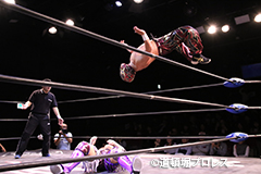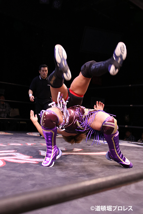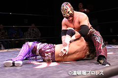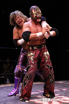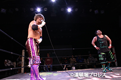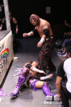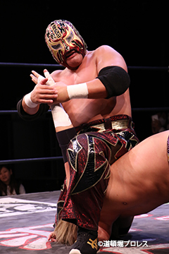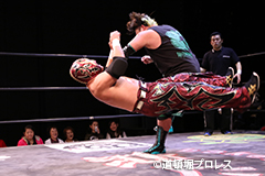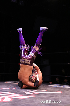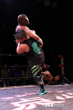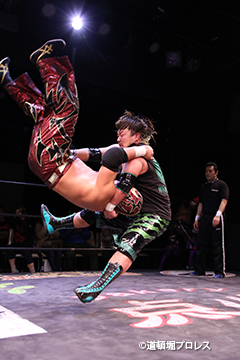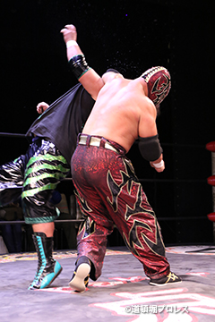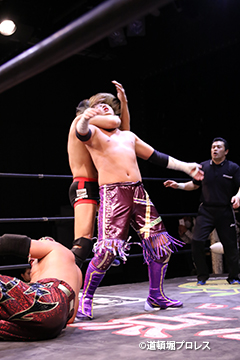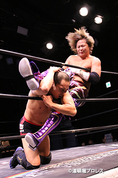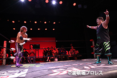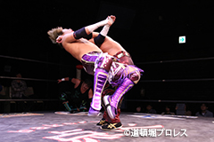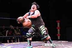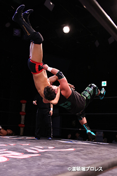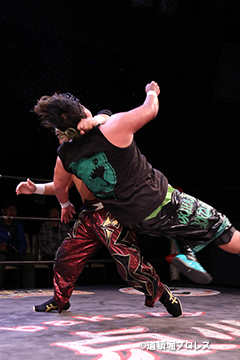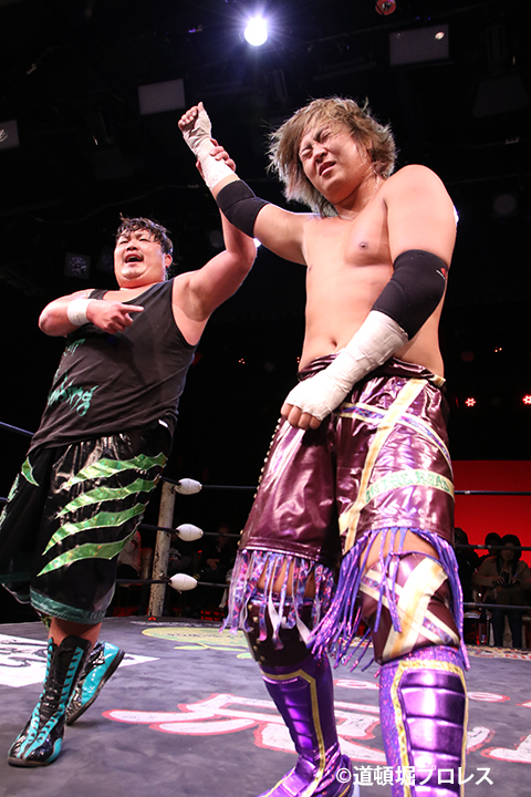 | 岸和田、冨宅は序盤からTORUの左腕に集中攻撃!三原のパワーで何度か盛り返すがTORUの左腕を責められる展開が続く。 TORUは岸和田のパワーに苦しめられ冨宅の殺人チョークスリーパーでもはやと思われたがバックに回るとハイスピードのドラゴンスープレックスで逆転勝利! TORU「勝ったぞー!このトーナメント、俺はWDWタッグ王座への挑戦者決定トーナメントとは思ってません。このトーナメントも立派なタイトルだと言いたいんですよ。ベルトに挑戦するためにトーナメント戦ってるわけじゃないんです、このトーナメントに優勝するために戦ってるんです。皆さんが言いたいこともわかってます。あいつら大日本プロレス、竹田誠志、沼澤邪気が好き勝手やってる。僕らは一回も当たってないけど試合もマイクアピールも先週の週刊プロレスの記事も全部読んで、ハラワタ煮えくり返ってるんですよ。俺と三原さんがこのトーナメント優勝してタッグキングのタイトルを取ってあいつらの持ってるタッグベルトと形上は俺らが挑戦者かもしれないけどwタイトルマッチのつもりで行ってやるよ、大日本プロレス!」 三原「TORU!このトーナメント全部朝飯前じゃ!食って食って優勝してお腹七分目くらいまでにしといて、あいつらに挑戦してお腹いっぱいにしようや!」 TORU「何が言いたいかというと大日本プロレス、ナメられてたまるかっていうことですよ!おい週刊プロレスもサムライTVも来てないからあいつらに伝えるのは(観客の)みなさんのSNSのチカラ!バンバン拡散してください。大阪で生意気な若手2人がほざいてたよって!まぁ何しか俺らの今の照準はこのトーナメント!あと2回勝ってタッグキングに俺たちがなるぞー!!」 |