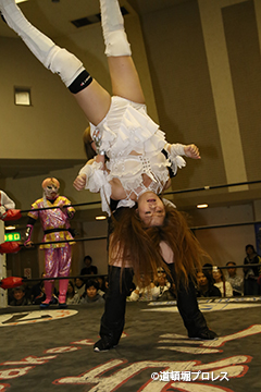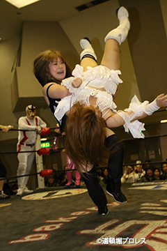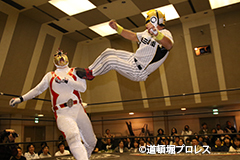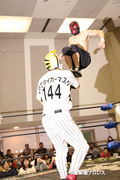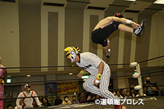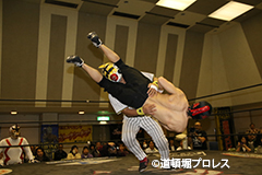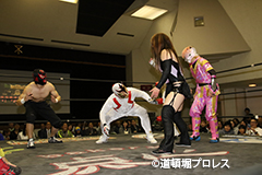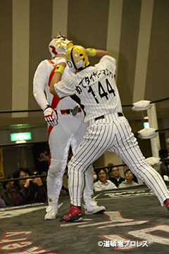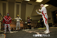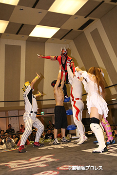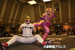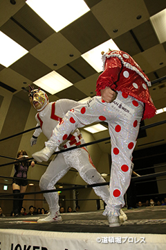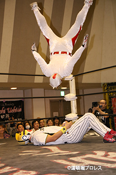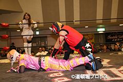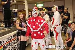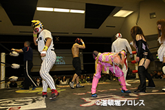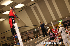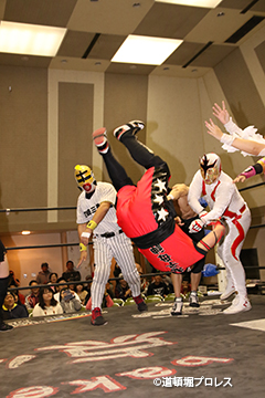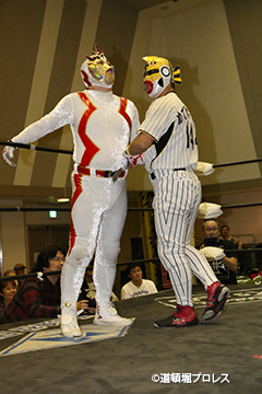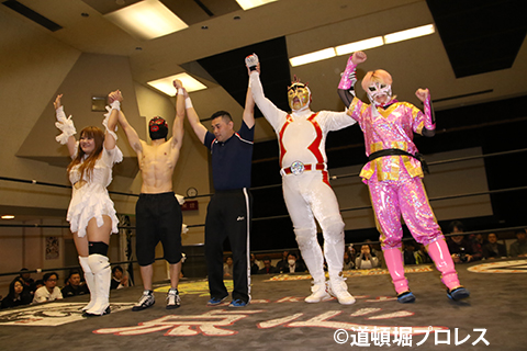 | 試合前に太陽塔仮面から12/23道頓堀プロレス新設のお笑いえぇ~感じベルト(仮称)争奪バトルロイヤルのエントリー選手が発表された。 ★道頓堀プロレス 太陽塔仮面、赤城、めでタイガーマスク、救世忍者乱丸、こなモン、 リアル・イヌナキン、スペル・ガトー ★ブルアーマーリングサービス ブルアーマーTAKUYA、めいりぃ ★フリー Ayaka ★なら万葉プロレス 高速もちつきマン、ポールブレイザー ★愛媛プロレス 凡人パルプ ★ジャパンプロレス2000 守屋博昭、佐々木幹也、嵐弾二郎 ★千日前プロレス ビリーザキッド8号 ★大阪プロレス くいしんぼう仮面 以上18名 引き続き決定次第、発表します。 |
