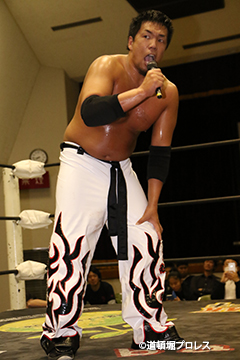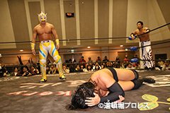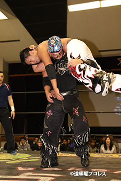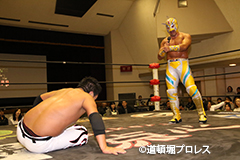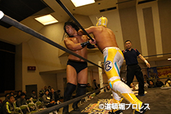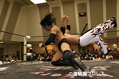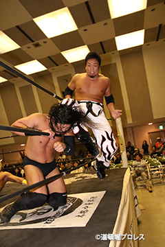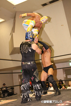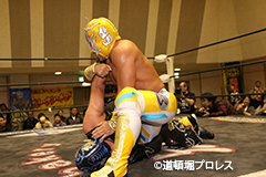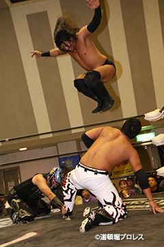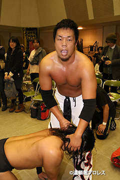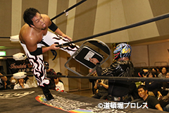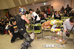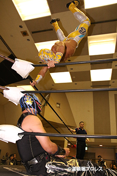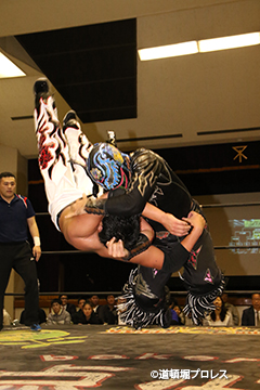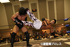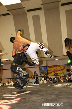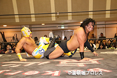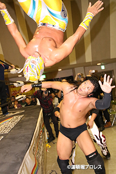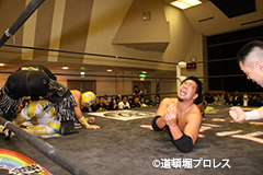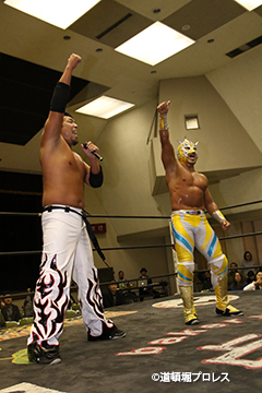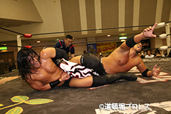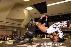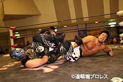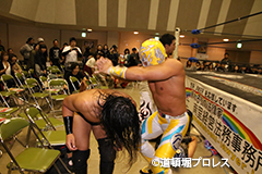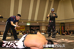 | ヲロチ、タダスケは徹底的に織部の左足を攻撃。織部は何度もギブアップしそうになりながらも耐え続け、ヲロチの鬼風車を丸め込み、3カウントで大逆転勝利! 次回大会、2回戦(準決勝)はTORU&三原一晃vsビリーケン・キッド&織部克巳となった。 |