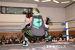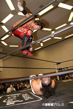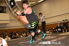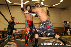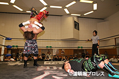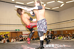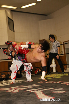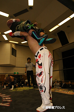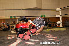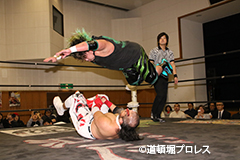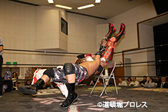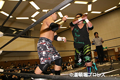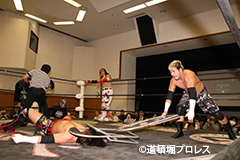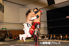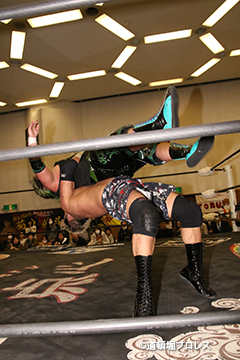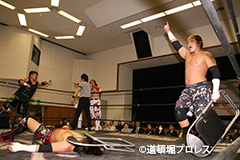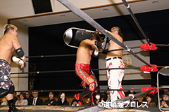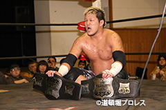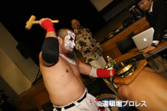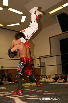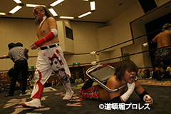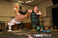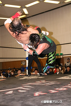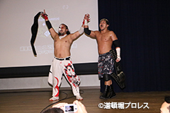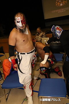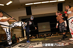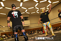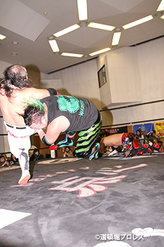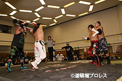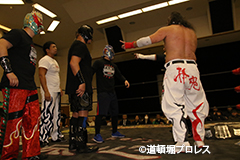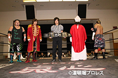 | 反則を駆使して勝利したチャンピオンチーム 沼澤が「タッグトーナメントに優勝チームに防衛した!次誰がいる?」と挑発。 すぐさまラ・ピート、織部、金龍がリングにあがりチャンピオンチームに詰め寄る。 続いて空牙、ビリー、冨宅もリングへ。 沼澤「元はと言えば、俺たちがベルト取った時、空牙と菅沼がトーナメントに優勝して挑戦すると言った。だがしかし優勝チームは三原とTORUだ。なんか言うことあるんじゃないですか?」 空牙「上等だよ、大日本プロレス!俺が取りに行ってやるよ!」 沼澤「まぁそういうと思ってました。たださっきのは優勝チームな訳だ。で挑戦するパートナーは誰がいる?菅沼とか言うんじゃないだろうな?」 空牙「俺のパートナーは…ビリーケンキッドや!ビリーと組んで俺らが大日本プロレスからベルトを取り返してやろうやないか。日にちを指定して返事よこせ!」 沼澤「まぁ菅沼とか言わなかったからよしとしよう。ただ、さっきの試合見てたでしょう?何するかわかんないぞ!あんた達、2度とマスク被れない顔になるかもしれない。それでもいいんならやってあげます、さいなら!」と沼澤、竹田はベルトを放り投げて引き上げる。 空牙「ビリーと組んで必ずベルトを取り返すんで、見に来いよ!」 空牙とビリーはガッチリ握手しベルト奪回を誓った。 |