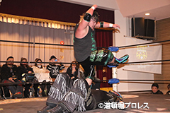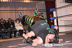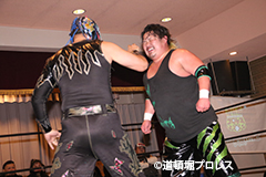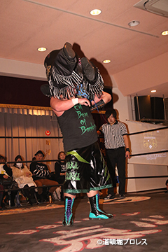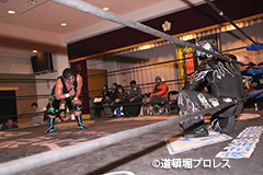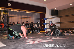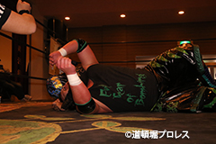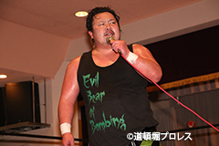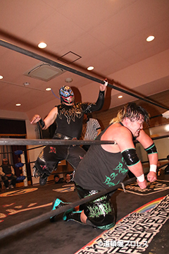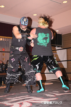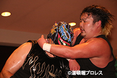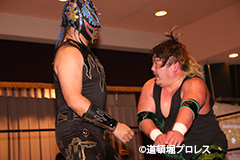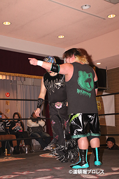 | 三原「ヲロチ!ありがとう・・・あんたとやると痺れるよ。俺はちょっと行き過ぎたエルボーをやる相手が居なくて物足りなかったからな、ヲロチ!あんたはやっぱ最高や。」 とヲロチを讃え続けて「今日来てないマグニチュード岸和田!お前の持つ道頓堀のベルトに俺が次、挑戦してやるよ。」とWDWのシングル王座への挑戦を表明した。 |