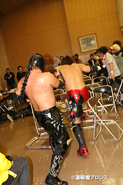 三原「おい!マグニチュード岸和田!お前チャンピオンなんやろ?ベルトはどうしたんや?ベルトも巻いてこんとどこのチャンピオンなんかわからんぞ!4月2日ベルト忘れんなよ。(ここで岸和田が引き上げる)俺は4月2日完全にあいつを仕留める。お前ら全員が岸和田が勝つやろうと思ってたら大間違いやぞ!あいつがもう二度と喋れんくらいボコボコにしてやるから見に来いよ!そして!4月2日のタイトルマッチ!勝つのはこの俺じゃ!」 |