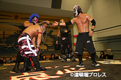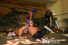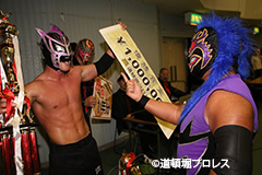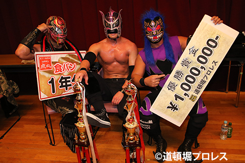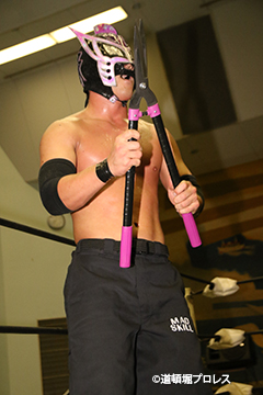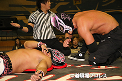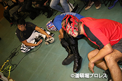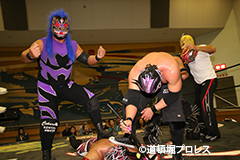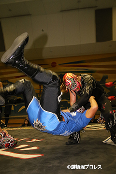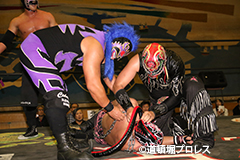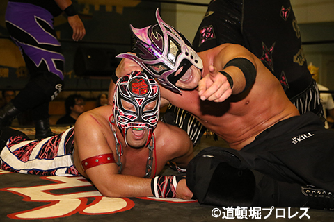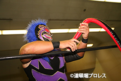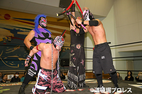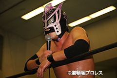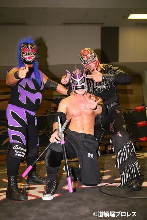 | 試合後のリング上でディアブロとヲロチがHUBを捕まえて、ラ・ピートがHUBのシッポをハサミで切り落とし、止めに入る選手を蹴散らす。 ラ・ピート 『道頓堀プロレス、随分変わったな? 道頓堀プロレスは何のために出来たんだよ。 空牙!前の団体から何人か引き連れてこのリングを作ったんだよな。 信玄はどこ行った?政宗はどこ行った?HAYATAはどこ行った?ガメラスはどこ行った? ヲロチは…こっちへ来たぞ! 次!何がお前の元からなくなると思う? その道頓堀プロレスのタッグのベルトだよ。 この道頓堀プロレスはお前の引退までの繋ぎの場じゃないんだよ。 俺とディアブロで12/22エディオンアリーナ、あいつらからタッグのベルト分捕ろうぜ! あと俺たち、ディアブロ、ラ・ピート、ヲロチ。俺たちのチーム名は『rage』(レイジ)だ! それにしても空牙信者どもは何も言ってこないのか?! お前らのボスをこんなこきおろしてもよぉ? あ、そう。じゃあな!』 と言い残すと本部席からトロフィーと優勝賞金100万円を奪いとった。 |