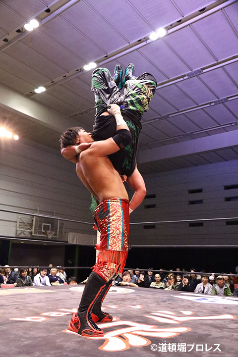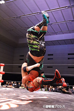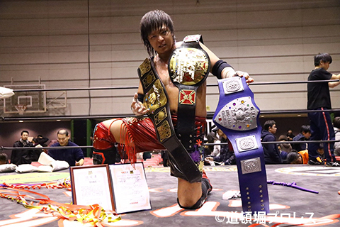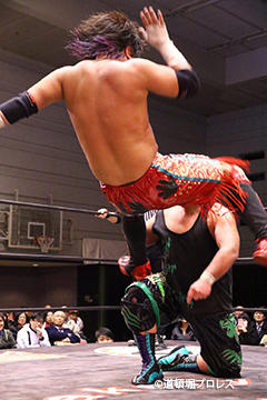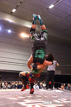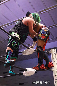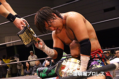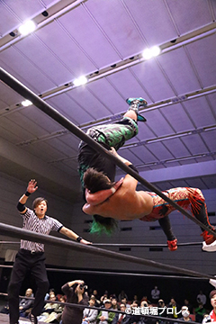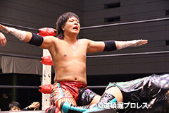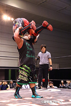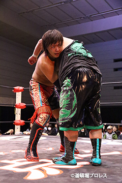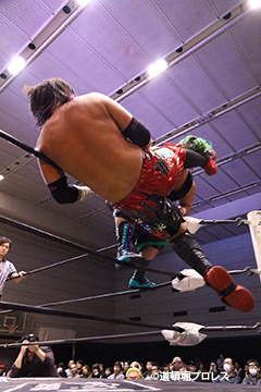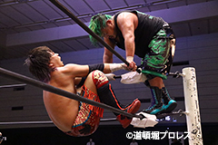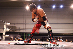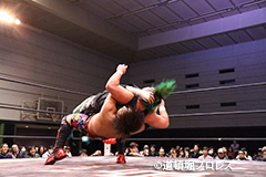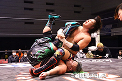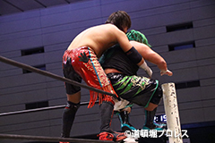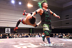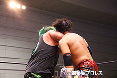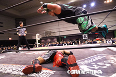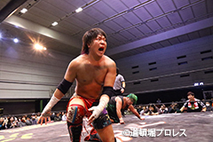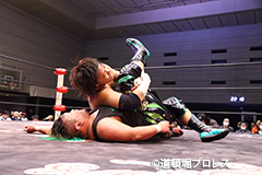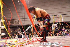| 38分を越す頂上決戦に勝利したのはTORU。どちらが勝ってもおかしくない激しい戦いだった。 試合後のリング上でのTORUのコメント 「そんなすぐ、マイクを渡されて、すぐしゃべれるような、安い試合やってないっスよ。 |