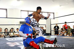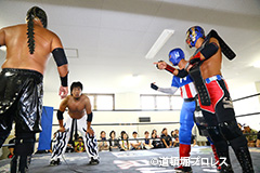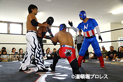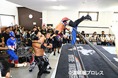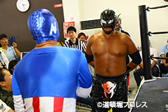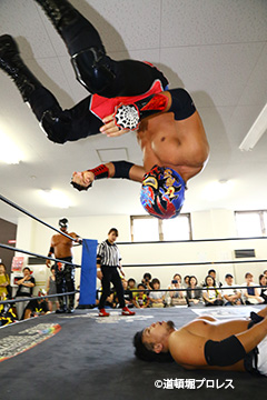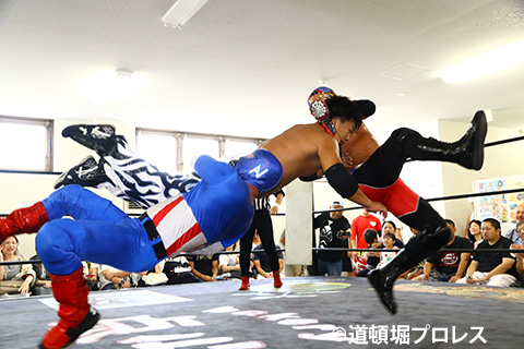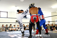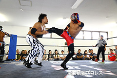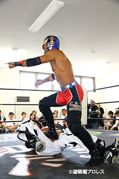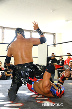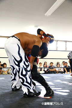 締めようとした空牙のマイクを奪い取った織部 スパイダー 9/16(日)道頓堀プロレス5周年記念大会において |