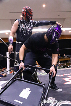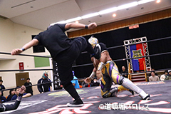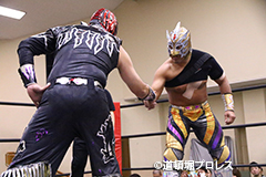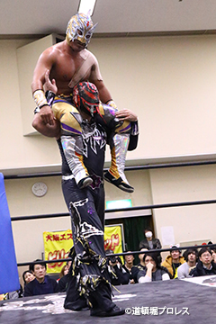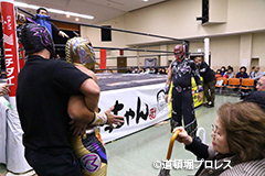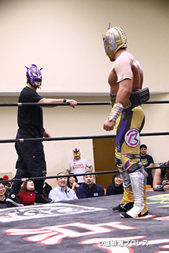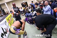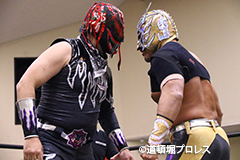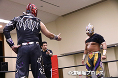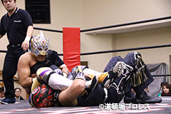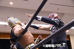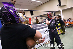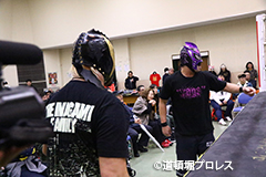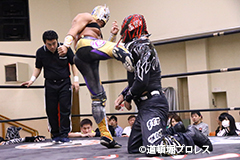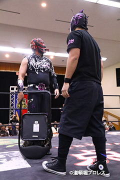 | 試合後のビリーケン・キッド 『ヲロチ!反則使わないと思ったら最初だけだったな。 『肩の怪我したふりしやがって卑怯者!ビリー、見損なったぞ。 『お前が来ないならディアブロとやってやるよ、ディアブロを倒したら次はお前しかいないよな。』 ビリーは3月大会、4月大会と出場しないため、4月14日和歌山大会でビリーvsディアブロのWDW選手権が決定した。4月14日和歌山大会の詳細については後日発表となる。 |