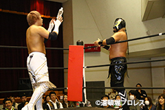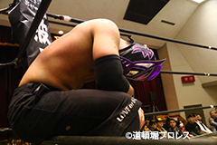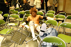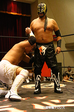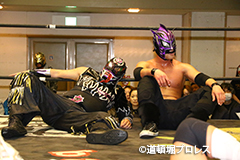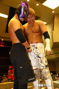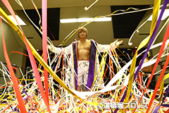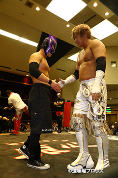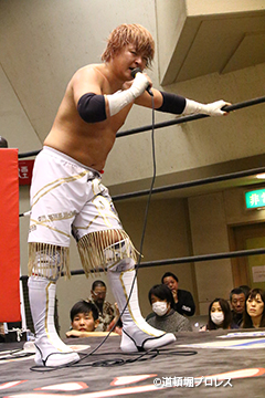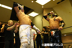 試合後のリング上でのTORUのコメント 出場選手全員でTORUを胴上げ、最後はヲロチとハグ、ラ・ピートとは握手を交わした。 |