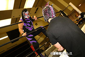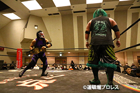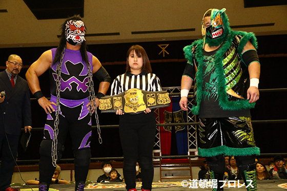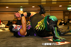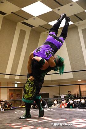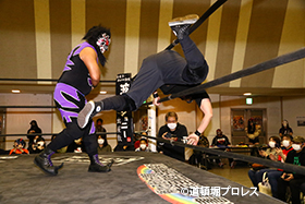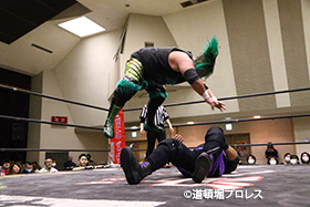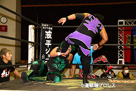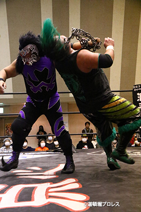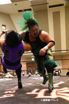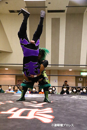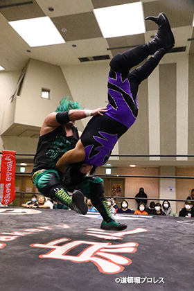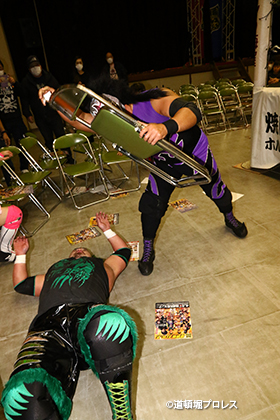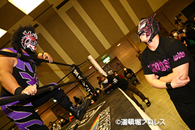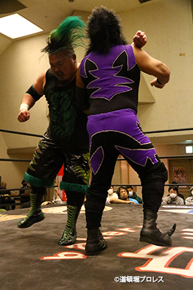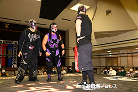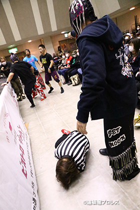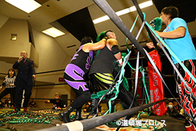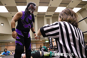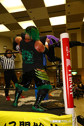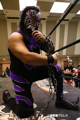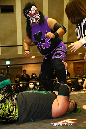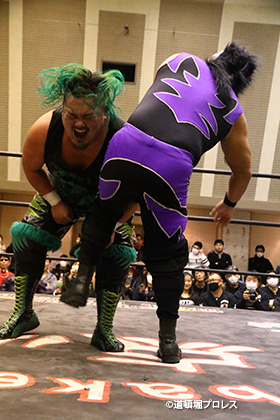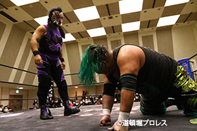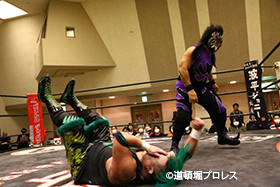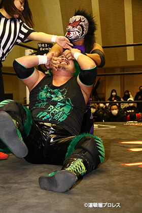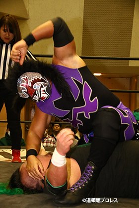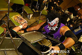 ラ・ピートの誤爆から三原のラリアットでベルトを失ったディアブロ。 |