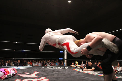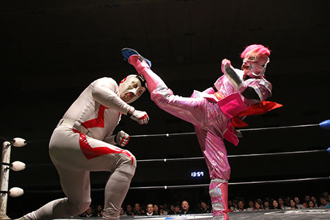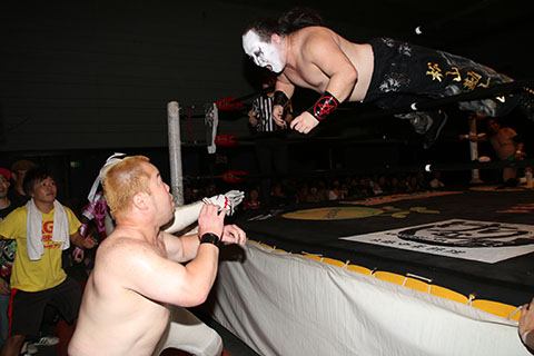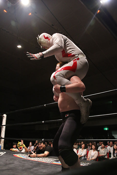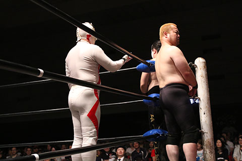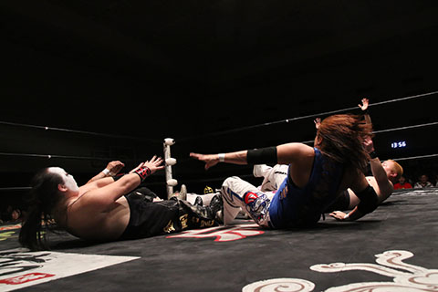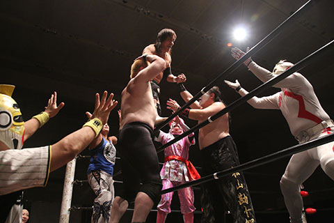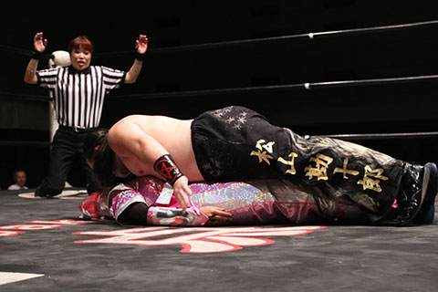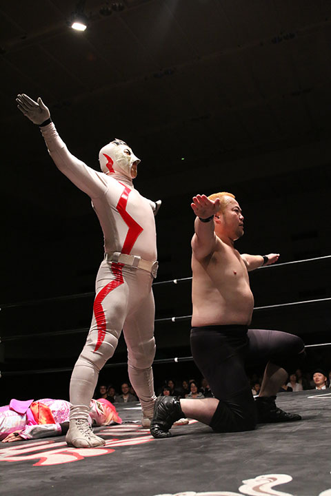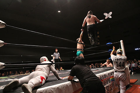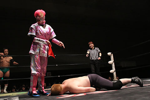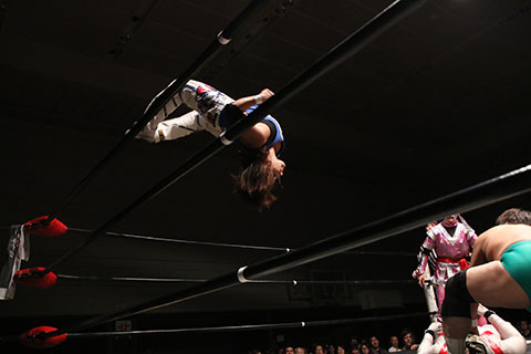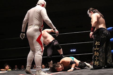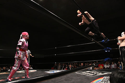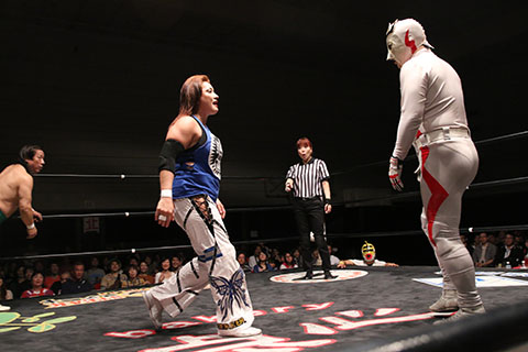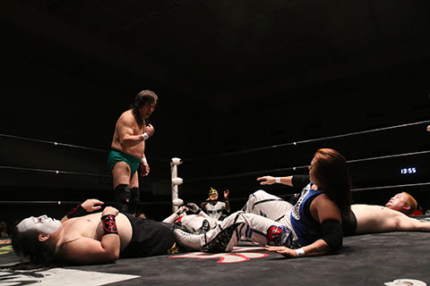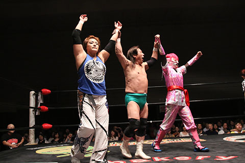第5試合 30分1本勝負 グラン浜田&◯浜田文子&救世忍者乱丸 (11分04秒、片エビ固め)太陽塔仮面×&菅沼修&松山勘十郎 ※ムーンサルトプレス