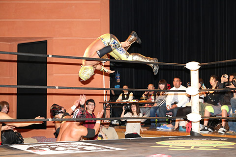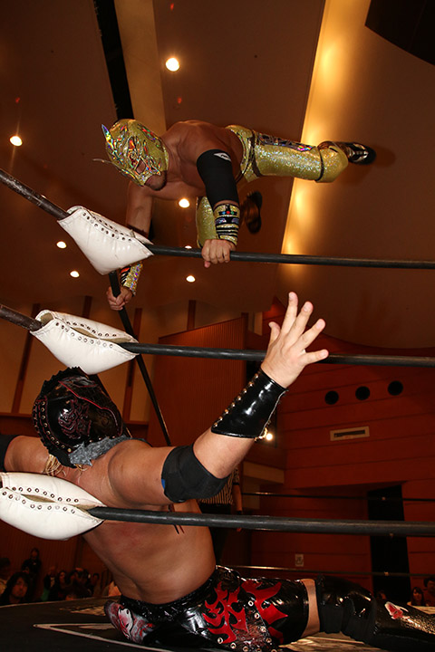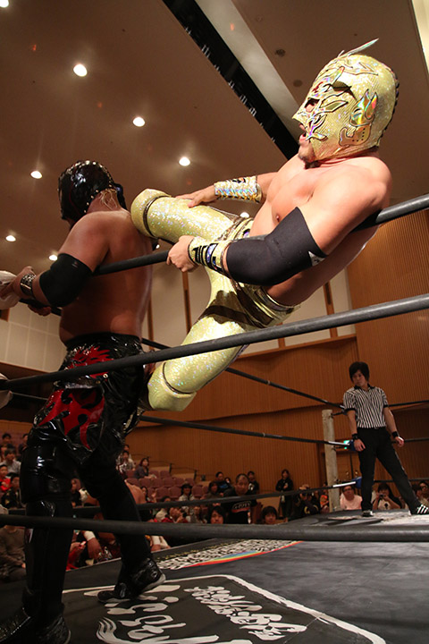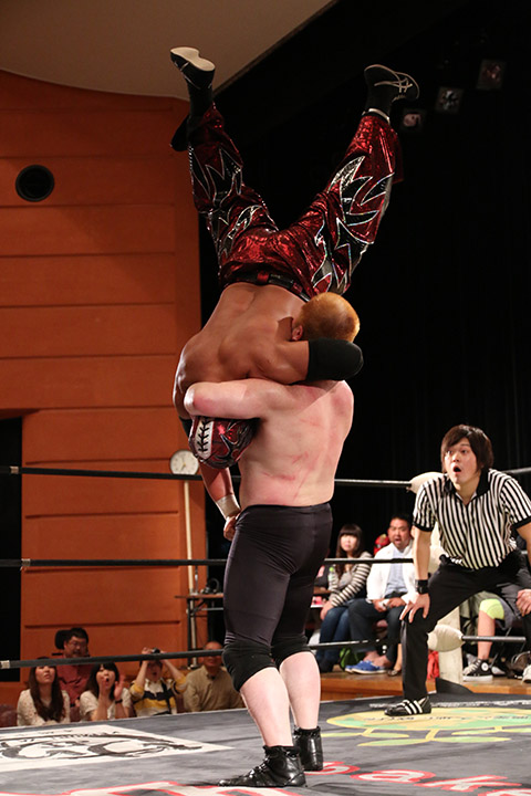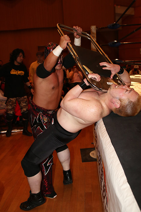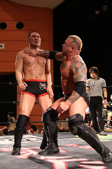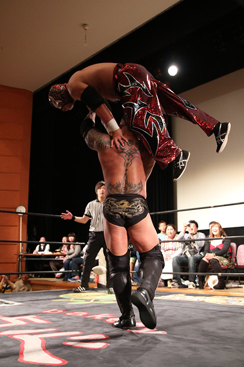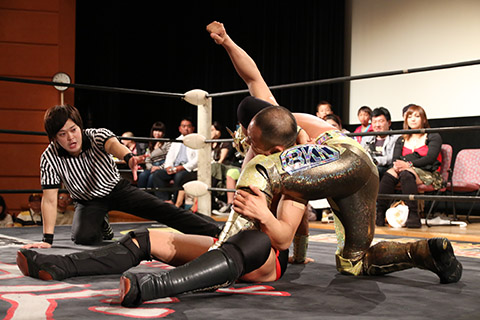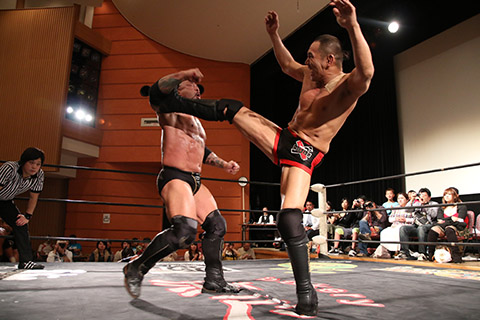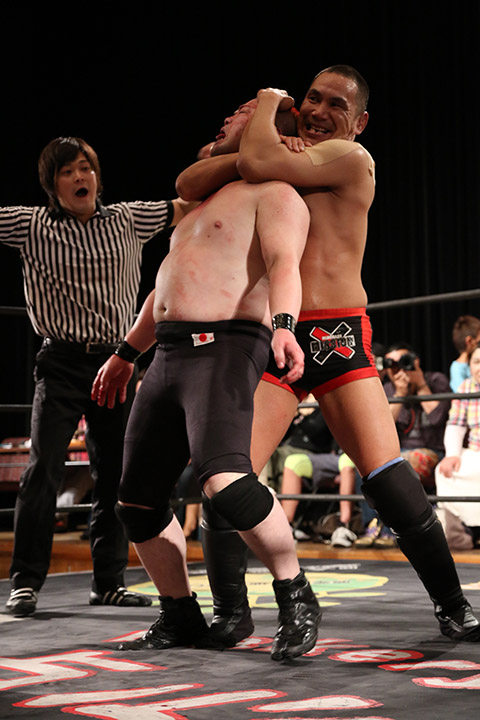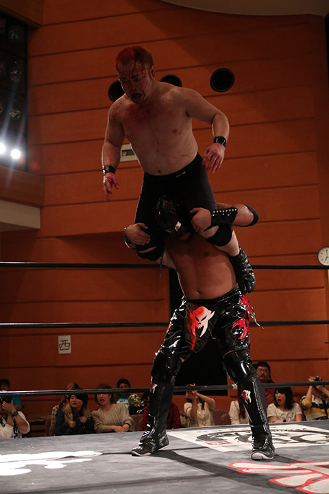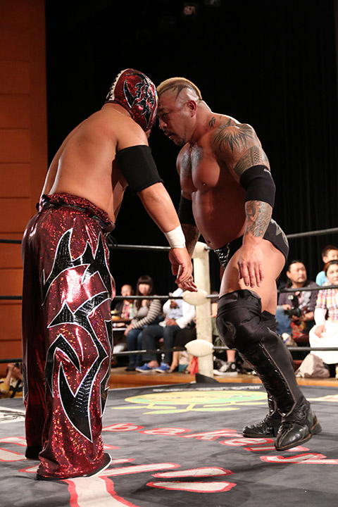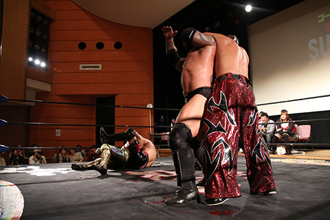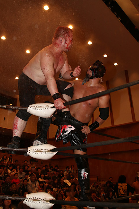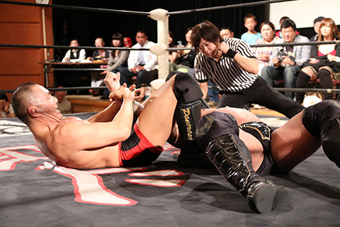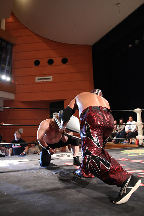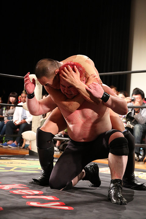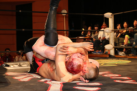 岸和田の椅子攻撃で菅沼が大流血するも最後は冨宅の殺人スリーパーを切り返して丸め込んで勝利!場内に大歓声が沸き起こった。