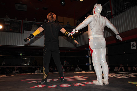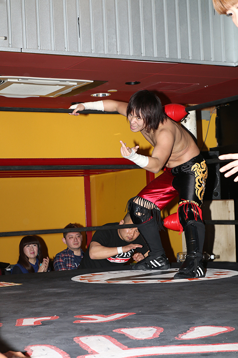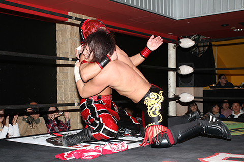 20分超の激しい戦いはMIYAWAKIのトップロープからの高角度の雪崩式ブレーンバスター、ミサイルキック、ラリアットからデスペナルティーの猛攻でフォールの体勢に入ったところをTORUが瞬時に丸め込んで3カウント。TORUが激しい戦いを制し大金星を上げた。