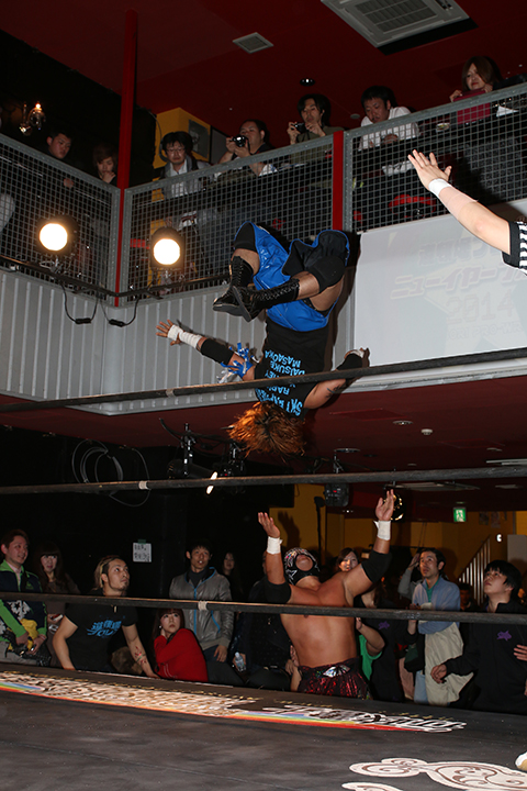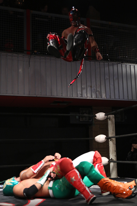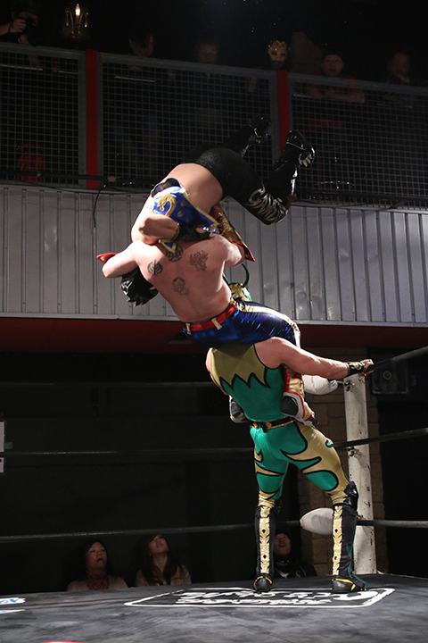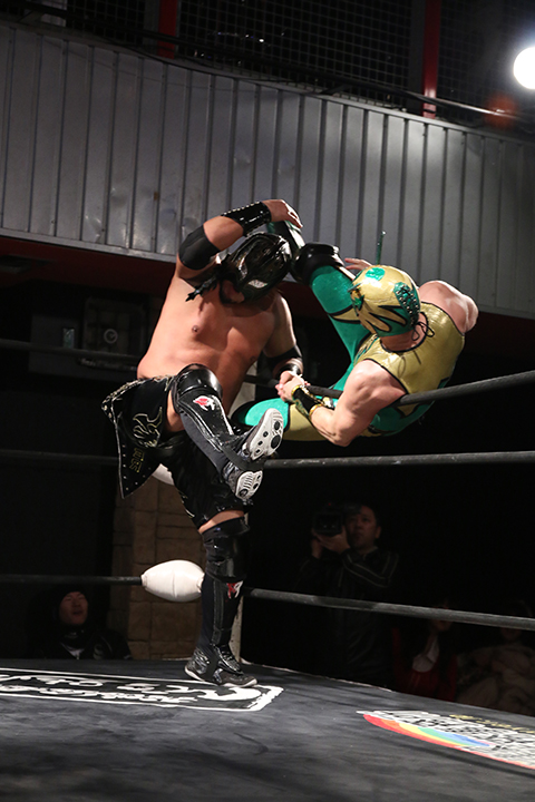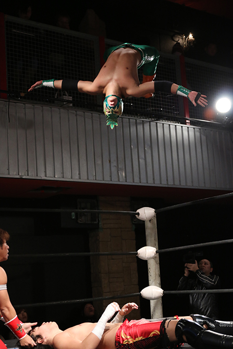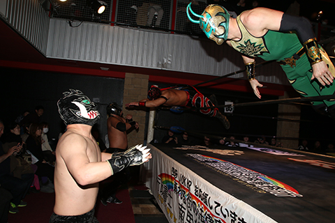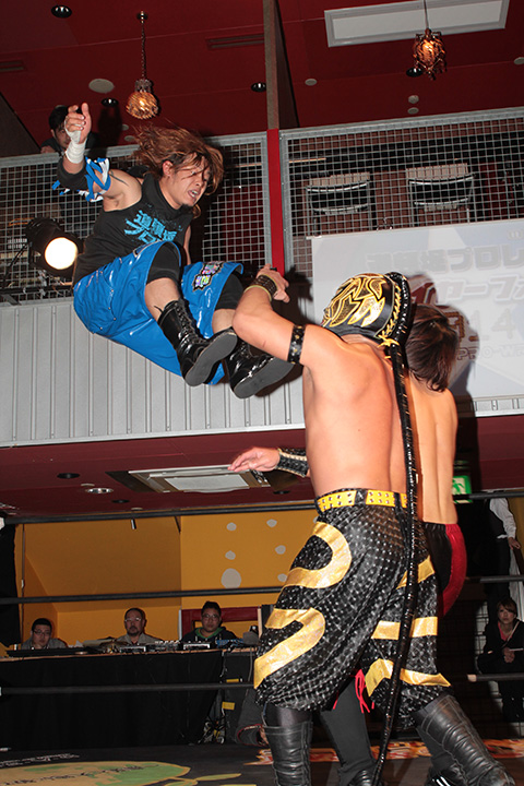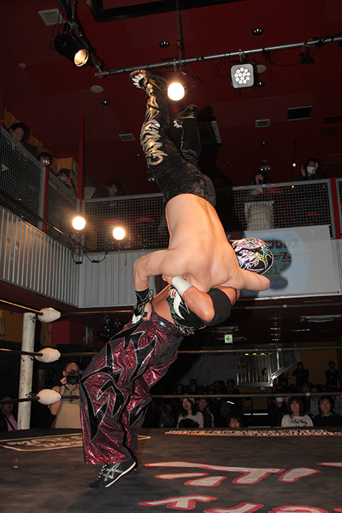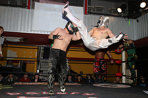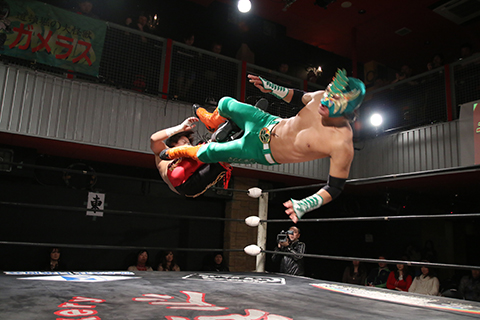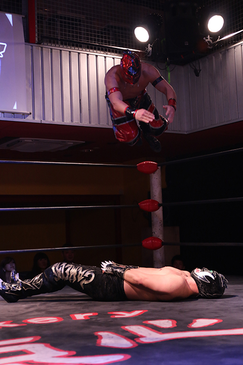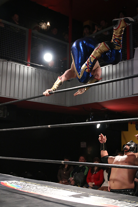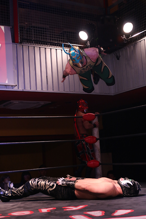 12月の和歌山大会でデビューしたサンショーマスクが道頓堀アリーナ初登場!華麗な空中殺法を披露するもラ・ピートには一歩及ばず。