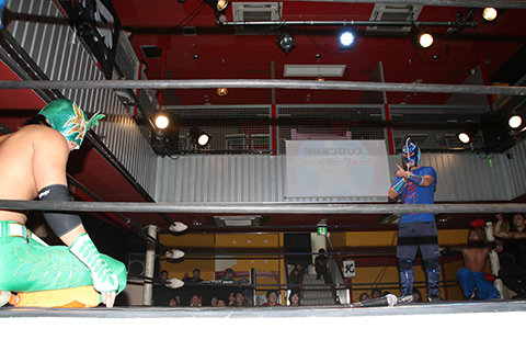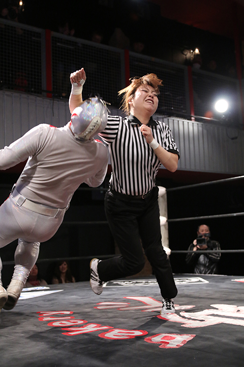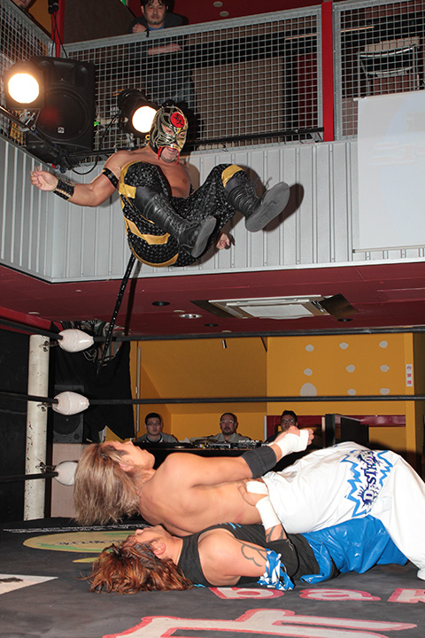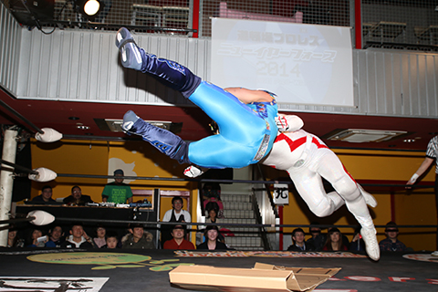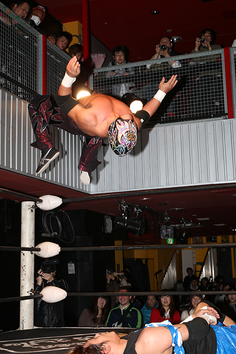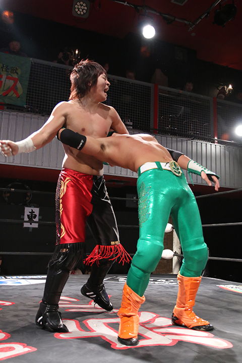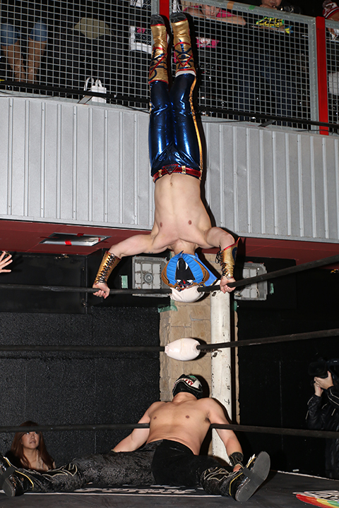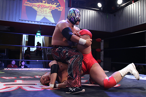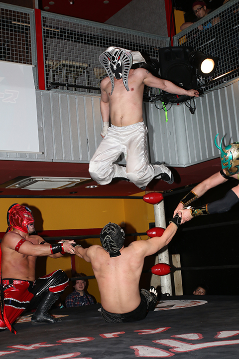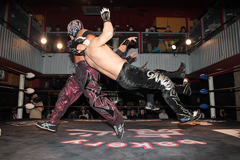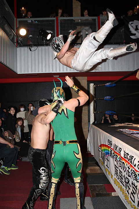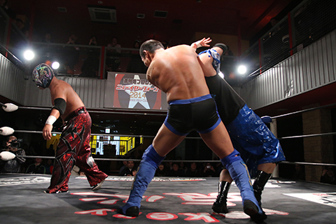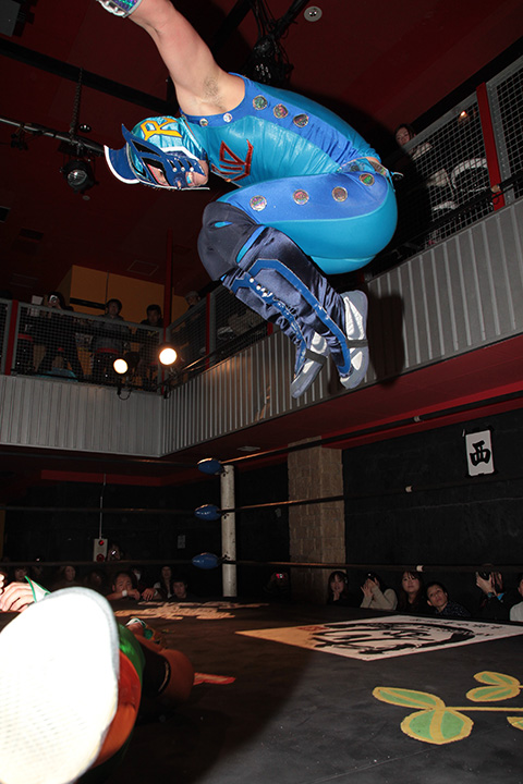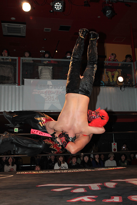 12月の和歌山大会でデビューしたサンショーマスクが道頓堀アリーナ初登場!華麗な空中殺法を披露するもラ・ピートには一歩及ばず。