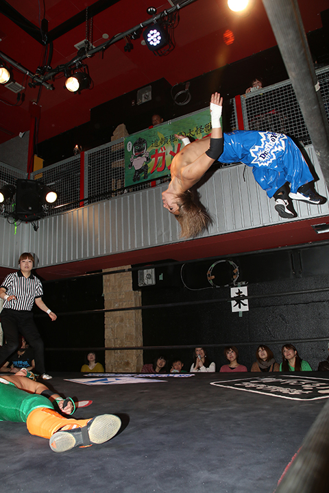 サンショーも美しいフォームのムーンサルトを繰り出すが、勝負を制したのはHAYATAのムーンサルト。