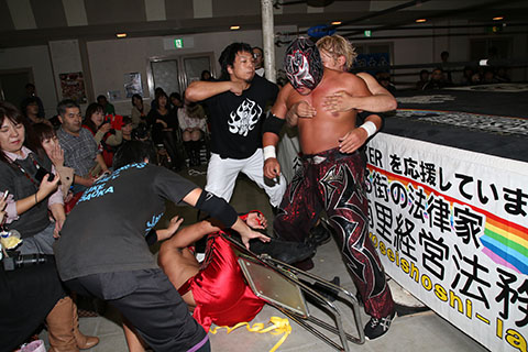試合後も納得いかない冨宅と岸和田はビリーと政宗に攻撃を加え乱闘。