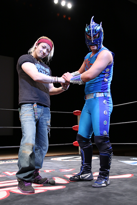 試合後、ラ・ピートがYO-HEYを呼び込む。