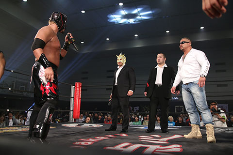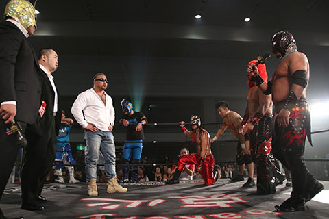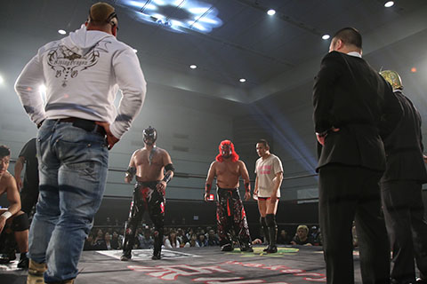 ビリーケンキッド「俺たちは覚悟を持ってここに来た。今日来た3人だけじゃない他にも俺たちと同じ気持ちの人間が居る。道頓堀プロレス!俺たちをリングにあげる勇気はあるのか?」